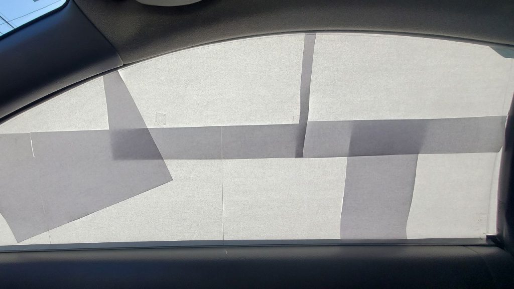 PP板を取り付けるサイズを決めるためにプラ段に紙を貼り付けます。型紙はちょうど窓と同じ大きさにしておき、カット自体はそれより2mmくらい小さめにしてます。