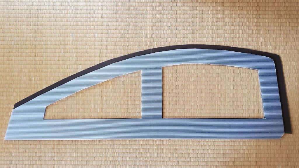 車内側から紙を張り付けて大まかな形をとります。これ自体は適当サイズでOKです。ドアを閉めたときに干渉しないように紙よりもオフセットさせてプラ段をカットしてます。